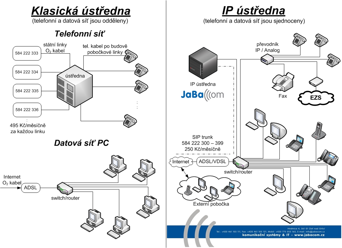 - Jednoduše modulární: rozšíření na více poboček = pouze dokoupit IP telefony.